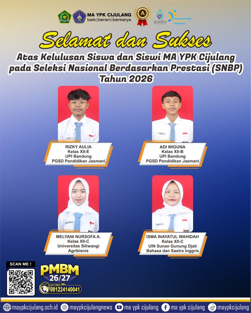 Cijulang – Kabar membanggakan datang dari MA YPK Cijulang. Empat siswa terbaiknya berhasil lolos dalam Seleksi Nasional Berdasarkan Prestasi (SNBP) Tahun 2026 dan diterima di perguruan tinggi negeri ternama di Indonesia. Prestasi ini menjadi bukti nyata kualitas pendidikan serta kerja keras siswa dan seluruh civitas akademika sekolah.